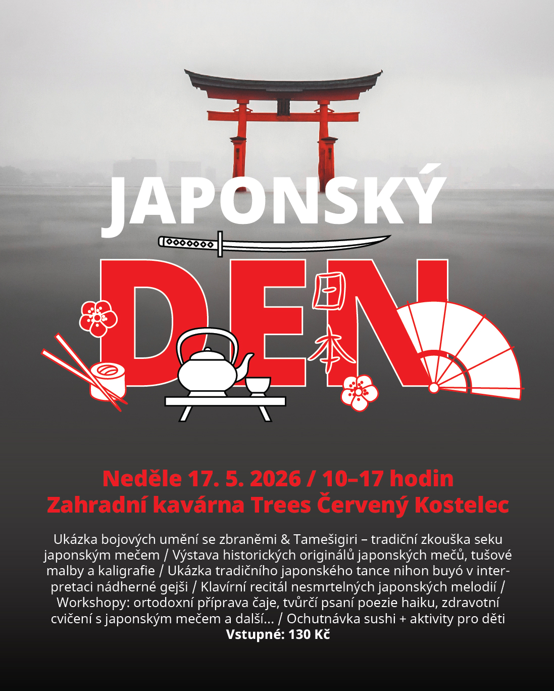 V neděli 17. května 2026 se naše zahradní kavárna Trees v Červeném Kostelci promění v místo, kde se propojí umění, kultura i klid dálného Východu. Od 10 do 17 hodin vás čeká bohatý program pro dospělé i pro děti. V kavárně bude možné ochutnat sushi od vyhlášené Yanna Sushi.